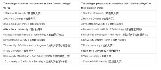 学术排名以外,《普林斯顿评论》每年都会调查学生和家长们心中的Dream Colleges。2003至2007年,纽约大学被评为美国高中毕业生最想进入的大学第一名。2014年版本的排名是《普林斯顿评论》抽样调查了一万多名学生和五千多名家长,在不考虑录取几率和高昂的学费的情况下投票选出的。学生和家长来自美国各个州,还包括国外的学生和家长。纽约大学被评为学生最想进入的大学第四名,家长希望孩子进入的大学第八名。具体排名如下: