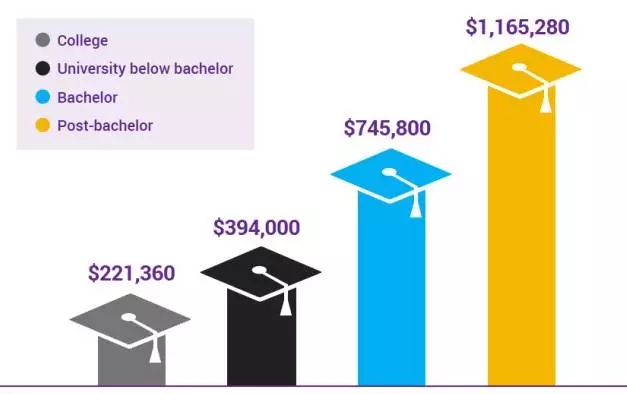不同学位水平的毕业生,像是高中毕业,和Master,PHD毕业生之间, 薪资差的也是很多的说,例如加拿大的学院,本科以下,本科,以及本科以上,平均工资就差别很大: