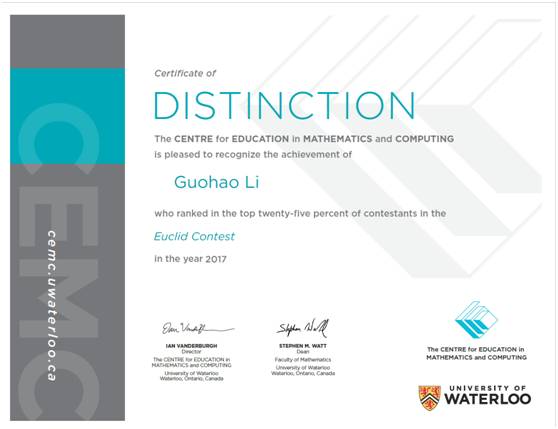 由加拿大著名的滑铁卢大学数学与计算机教育中心主办的欧几里德(Euclid)数学竞赛共10道题,分为三大部分,满分为100分。其主旨是为考察学生对代数及几何全方面的理解与延伸。滑铁卢大学举办此项竞赛的目的是一方面培养学生对数学的兴趣以及增进数学的解题能力,另一方面对学生报考大学会是重要的参考因素之一。参加竞赛的学生都有入围滑铁卢大学数学系奖学金评选的资格。竞赛成绩在全体学生中排名前25%的学生将获得优秀证书,此证书被北美知名大学的广泛认可。安博逊高中为培养和提高学生对数学的兴趣和能力,以及提高名校入取率。学校的任课老师积极组织学生参与欧几里德数学竞赛。任课老师会根据学生的情况,挑选对数学具有浓烈兴趣及有相关天赋的学生进入数学课外小组。任课老师们利于课余时间对学生们进行辅导并且带领学生参加竞赛。