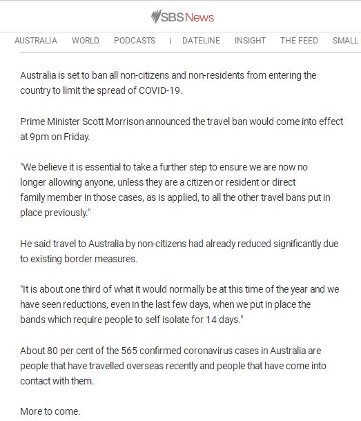 非澳大利亚人进入澳大利亚的最后期限为3月20日明晚9点。