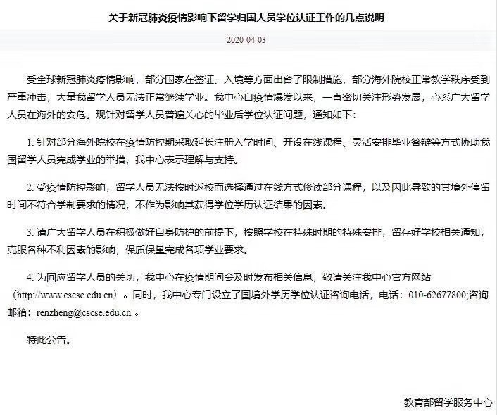 “疫情下提前回国了,学位认证怎么办?”这个问题终于在今天得到了教育部留学服务中心官方的答案:受疫情防控影响,留学人员无法按时返校而选择通过在线方式修读部分课程,以及因此导致的其境外停留时间不符合学制要求的情况,不作为影响其获得学位学历认证结果的因素。