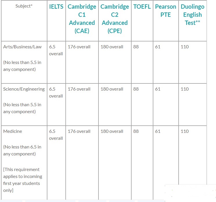 ● DET 110分 等同于 IELTS 6.5, 单项不低于6。适用于所有本科,硕士的 工程与计算机学院 和 科学与健康学院, 商学院下面的金融学和国际会计与商业硕士。