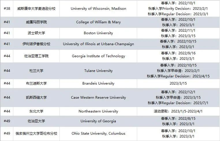从入学时间来看,多数学校的转学只能秋季入学,提交转学申请的截止日期在2月到6月不等。排名前30的学校转学申请截止时间大多在2、3月。比较特殊的是加州大学系统,该校的转学申请截止日期和新生申请相同,均为11月30日。