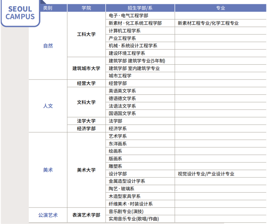 弘益大学是韩国优秀的综合性大学,并在艺术领域最为突出,尤其以美术、设计专业最为著名,是亚洲顶级设计院校,世界著名艺术学府 。除此之外,还拥有建筑学、电子信息、控制工程、海洋工程、经营学、广告学、视觉设计、工业设计、空间设计、影视多媒体以及动画、游戏等强势专业。